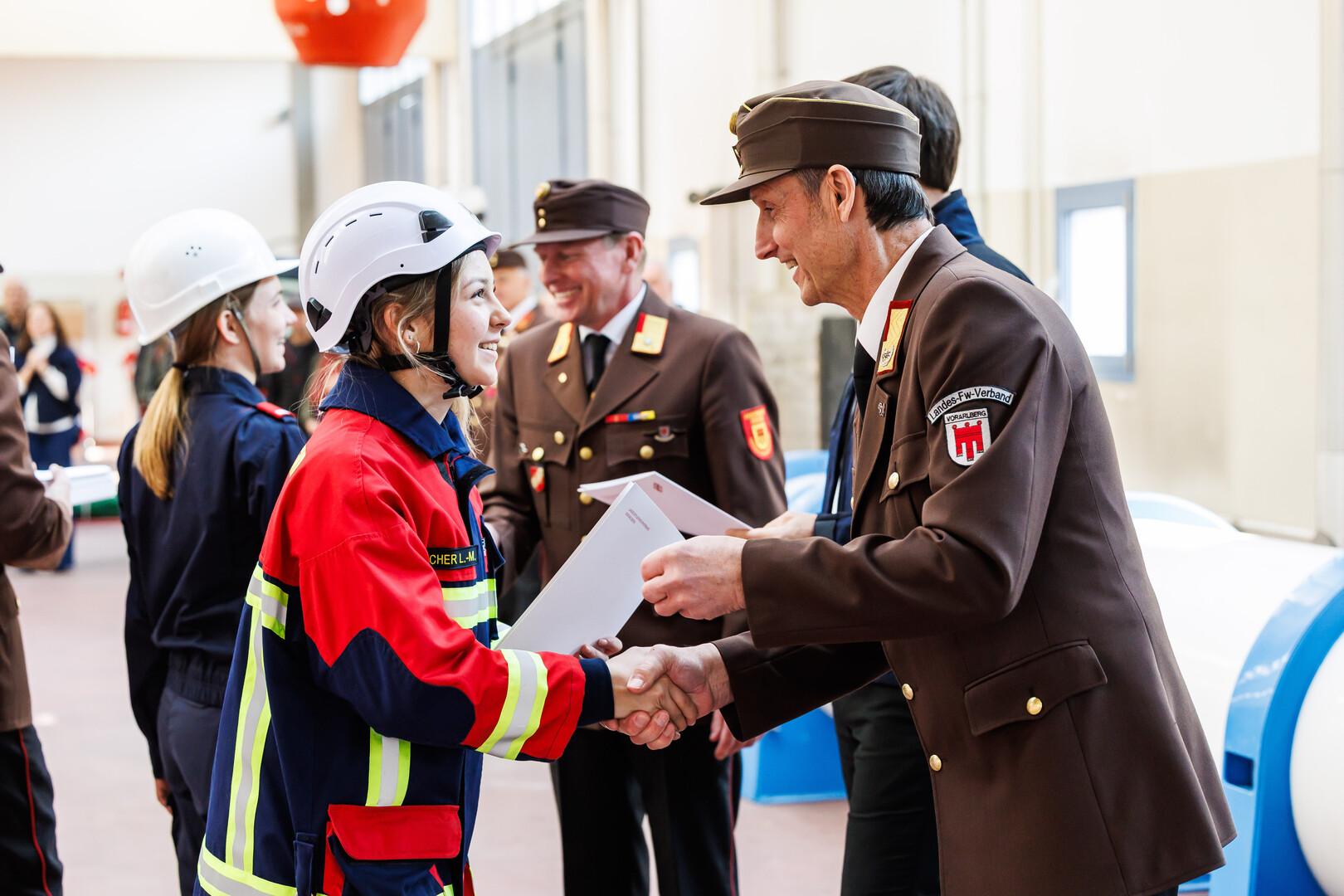 Bei der Siegerehrung, bei der alle 45 Jugendlichen das höchste Leistungsabzeichen entgegennehmen konnten, waren zahlreiche Ehrengäste anwesend. Der Landesjugendreferent aus Vorarlberg Oliver Berger überreichte gemeinsam mit dem Verbandsvorsitzenden-Stellvertreter Andreas Hosp die Goldenen Abzeichen. Die Bezirksfeuerwehrinspektoren, die Landesjugendreferentin aus Tirol Magdalena Bichler und zahlreiche Kommandanten gratulierten den Jugendlichen zu ihrem Erfolg.![]()